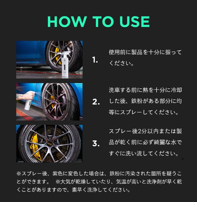※噴射後に長時間放置すると塗装やホイールに悪影響を与える恐れがあります。