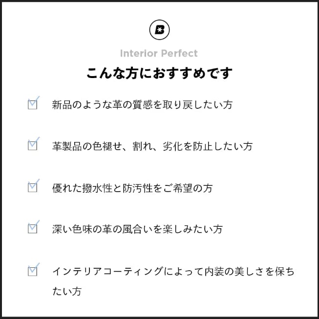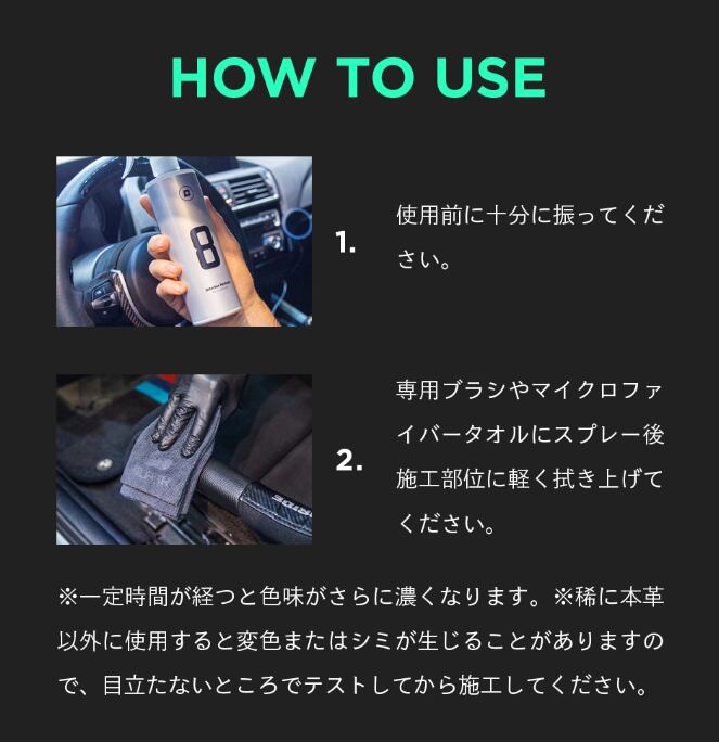 ※稀に本革以外に使用すると変色またはシミが生じることがありますので、目立たないところで少量テストしてから施工してください。